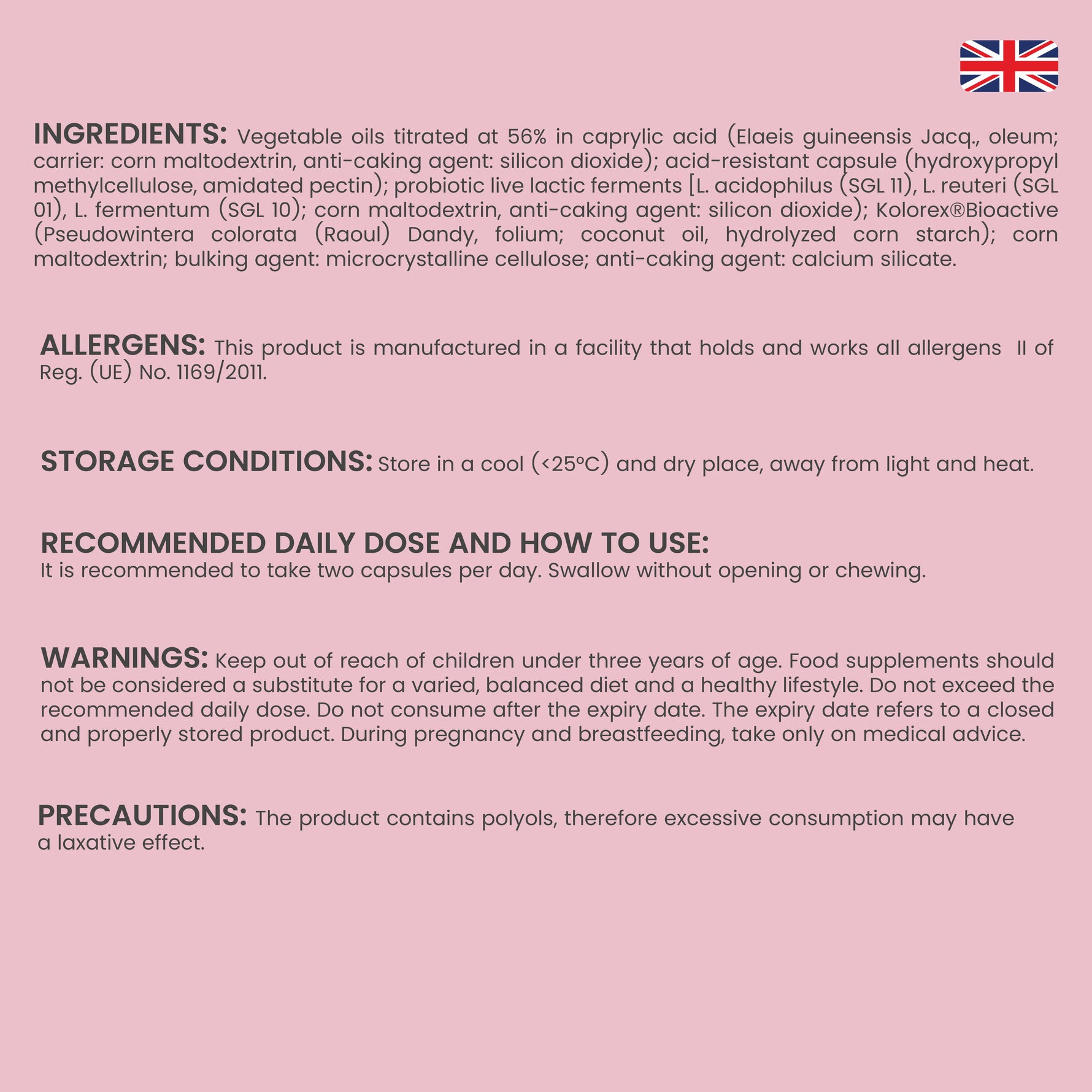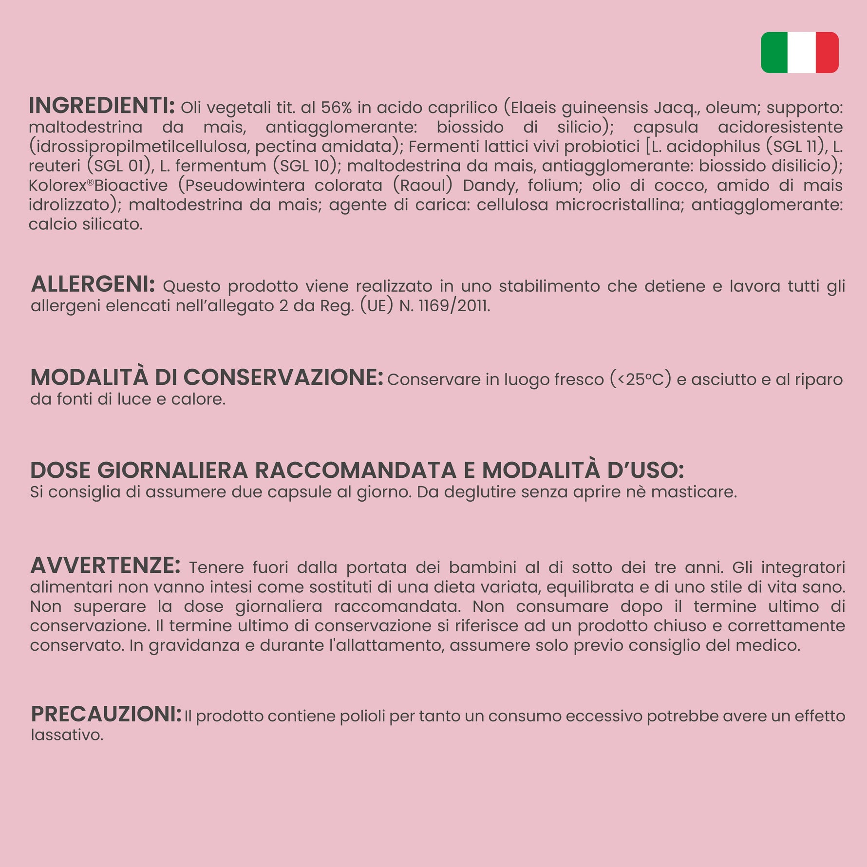 Oli vegetali 56% in acido caprilico (Elaeis guineensis Jacq., oleum; supporto: maltodestrina da mais,antiagglomerante: biossido di silicio); capsula acidoresistente (idrossipropilmetilcellulosa, pectina amidata); Fermenti lattici vivi probiotici [L. acidophilus (SGL 11), L.reuteri (SGL 01), L. fermentum (SGL 10); maltodestrina da mais, antiagglomerante: biossido di silicio); Kolorex®Bioactive (Pseudowintera colorata (Raoul) Dandy, folium; olio di cocco, amido di mais idrolizzato); maltodestrina da mais; agente di carica: cellulosa microcristallina;