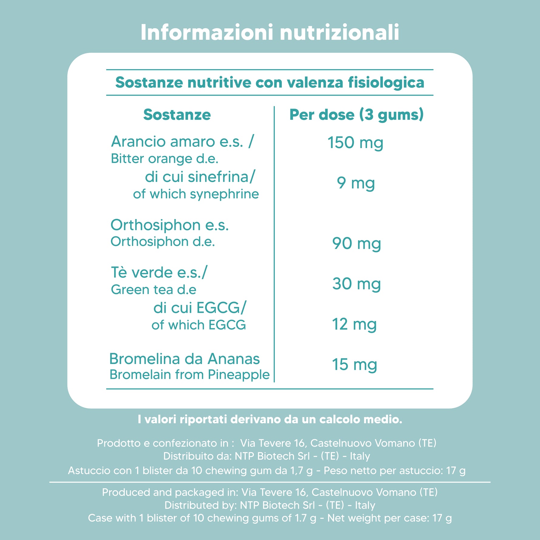 Agente di carica: gomma base [gomma base(*) ; dolcificanti: isomalto, sorbitolo; aromi antiagglomerante: talco; emulsionanti: glicerolo monostearato (E473); antiossidante: tocoferoli (E306)]; dolcificanti e agenti di rivestimento: xilitolo, sorbitolo, mannitolo; antiagglomeranti: talco, biossido di silicio, sali di magnesio degli acidi grassi; aromi; agenti di rivestimento: gomma arabica, clorofillina rameica (E141), cera carnauba; e.s. di Citrus aurantium tit. 6% in sinefrina (Citrus Aurantium var. amara L. fructus immaturus; maltodestrina da mais); e.s. di Orthosiphon tit. 1,5% in acido rosmarinico (Orthosiphon stamineus Benth, foglie; maltodestrina da mais); edulcoranti: glicosidi steviolici da Stevia (E960a), sucralosio, acesulfame K, taumatina; e.s. di Tè Verde tit. 98% in polifenoli e 40% in EGCG (Camellia sinensis (L.) Kuntze, foglie; maltodestrina da mais); Bromelina 2500 GDU (da Ananas comosus L. Merr; stipites);