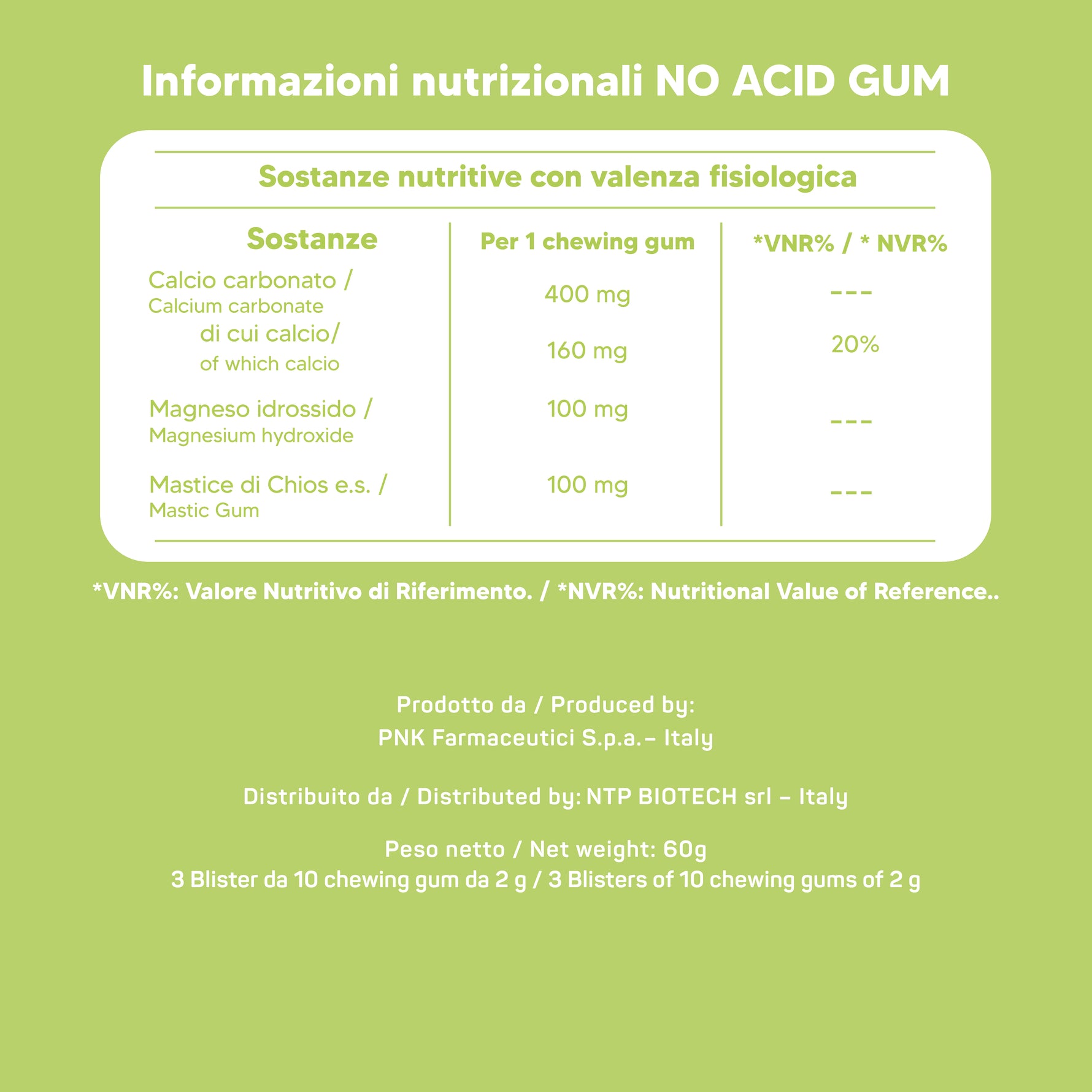 Calcio carbonato; maltodestrina da mais; magnesio idrossido; agente di carica: isomalto; Mastice di Chios (Pistacia Lentiscus var. Chia, resina; maltodestrina da mais); edulcorante; sucralosio