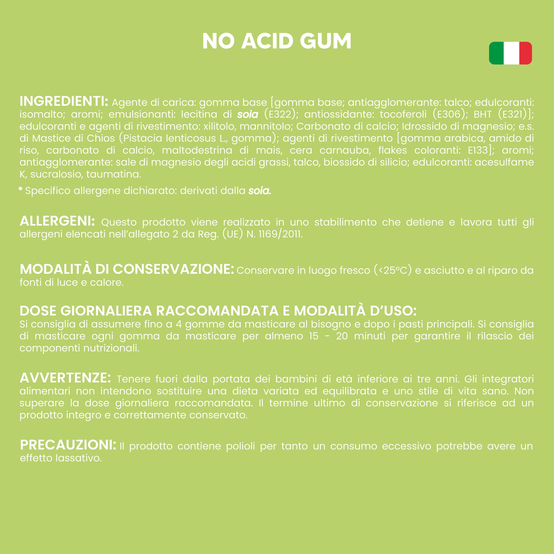 Agente di carica: gomma base [gomma base; antiagglomerante: talco; edulcoranti: isomalto; aromi; emulsionanti: lecitina di soia (E322); antiossidante: tocoferoli (E306); BHT (E321)]; edulcoranti e agenti di rivestimento: xilitolo, mannitolo; Carbonato di calcio; Idrossido di magnesio; e.s. di Mastice di Chios (Pistacia lenticosus L., gomma); agenti di rivestimento [gomma arabica, amido di riso, carbonato di calcio, maltodestrina di mais, cera carnauba, flakes coloranti: E133]; aromi; antiagglomerante: sale di magnesio degli acidi grassi, talco, biossido di silicio; edulcoranti: acesulfame K, sucralosio, taumatina
