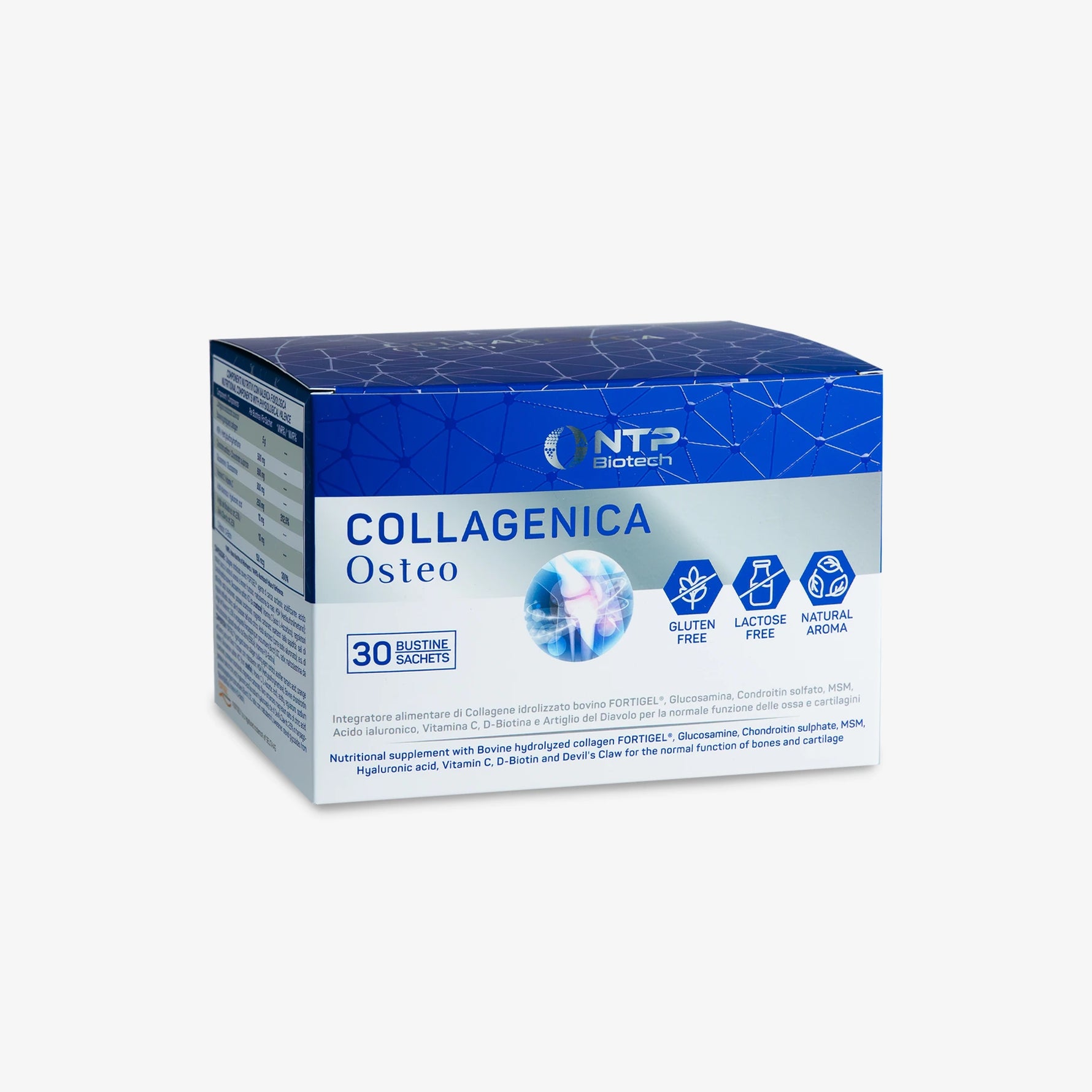 Collagenica Osteo is a food supplement in sachets with: FORTIGEL® hydrolyzed collagen, MSM, chondroitin sulfate, glucosamine, hyaluronic acid, dry extract of Harpagophytum procumbens, D-Biotin and Vitamin C.