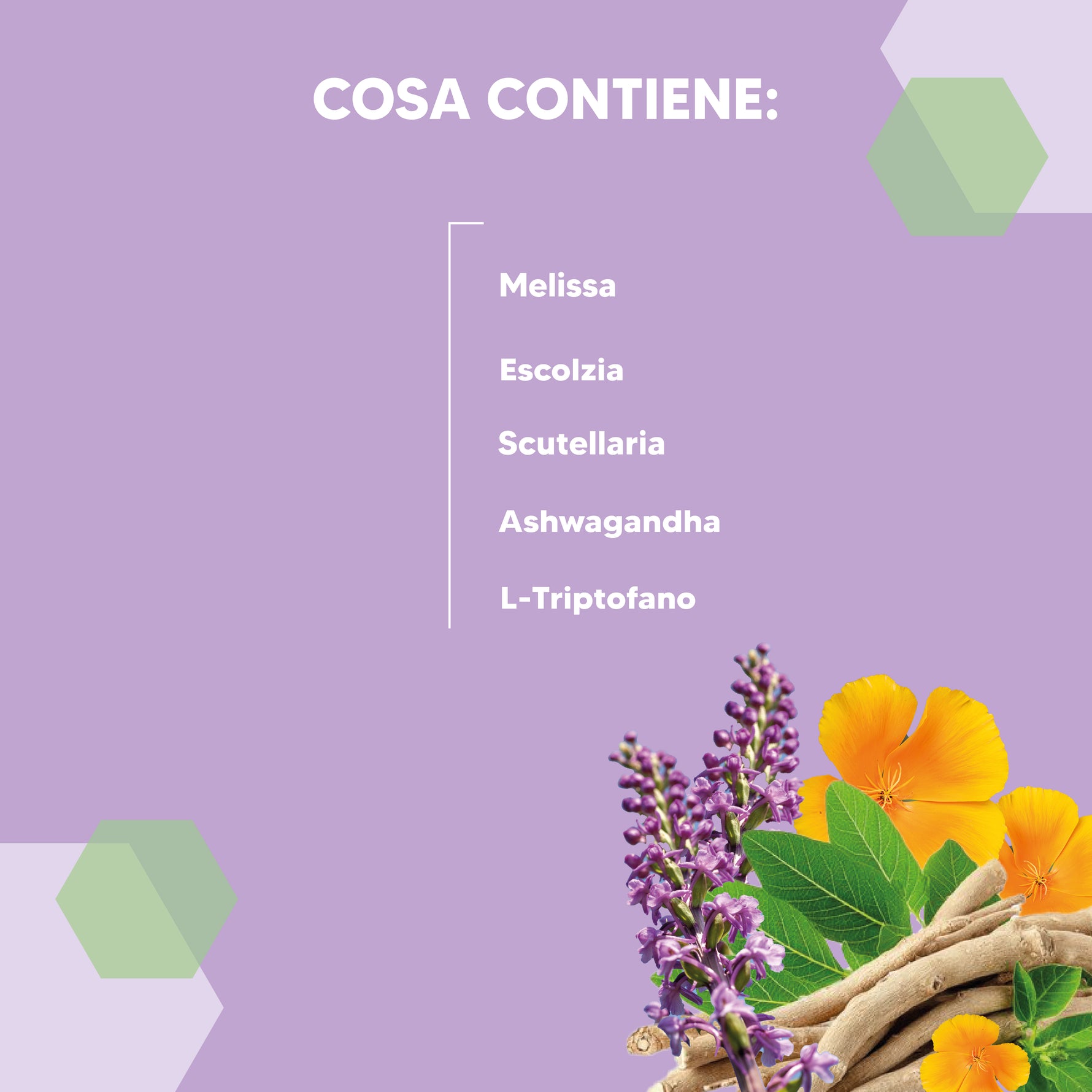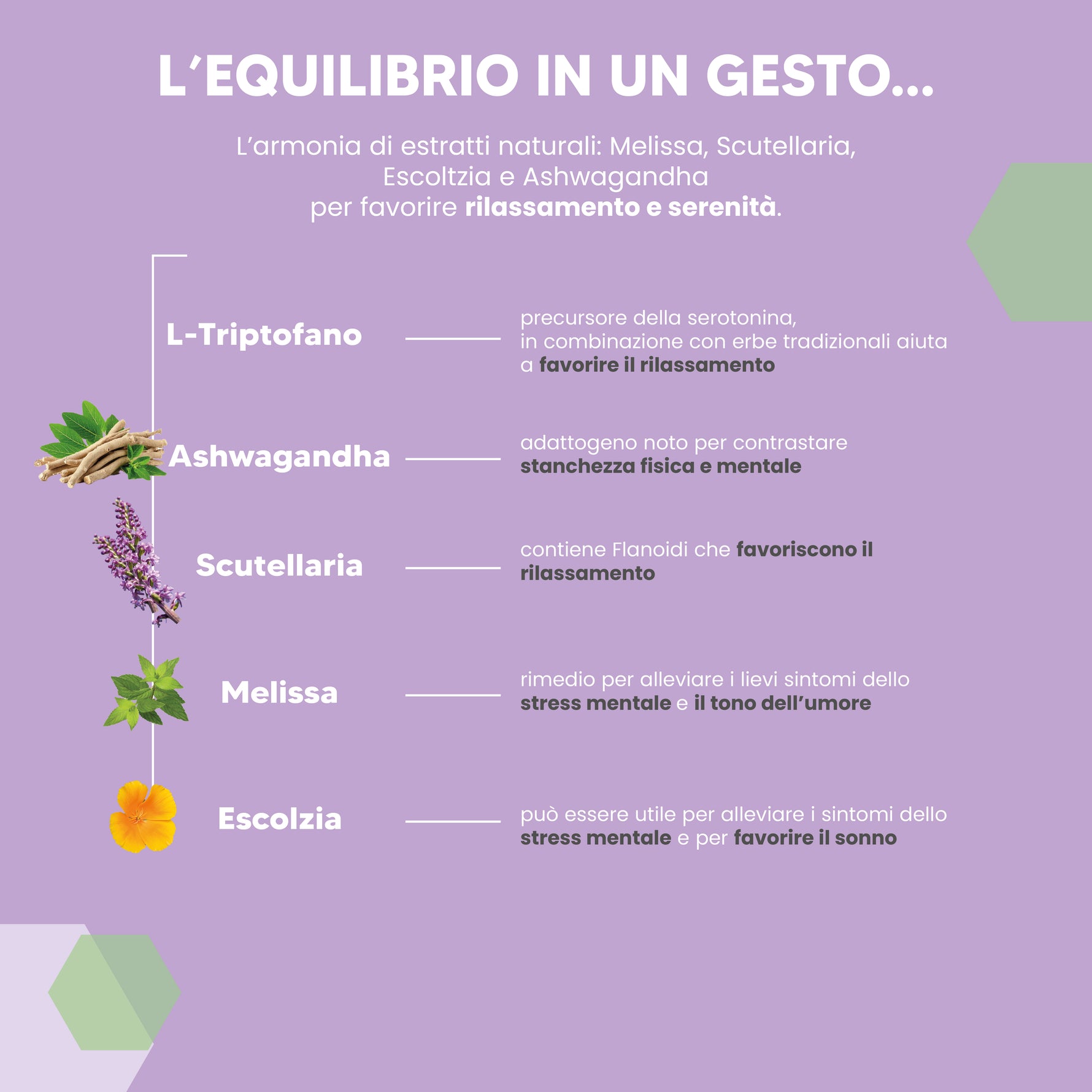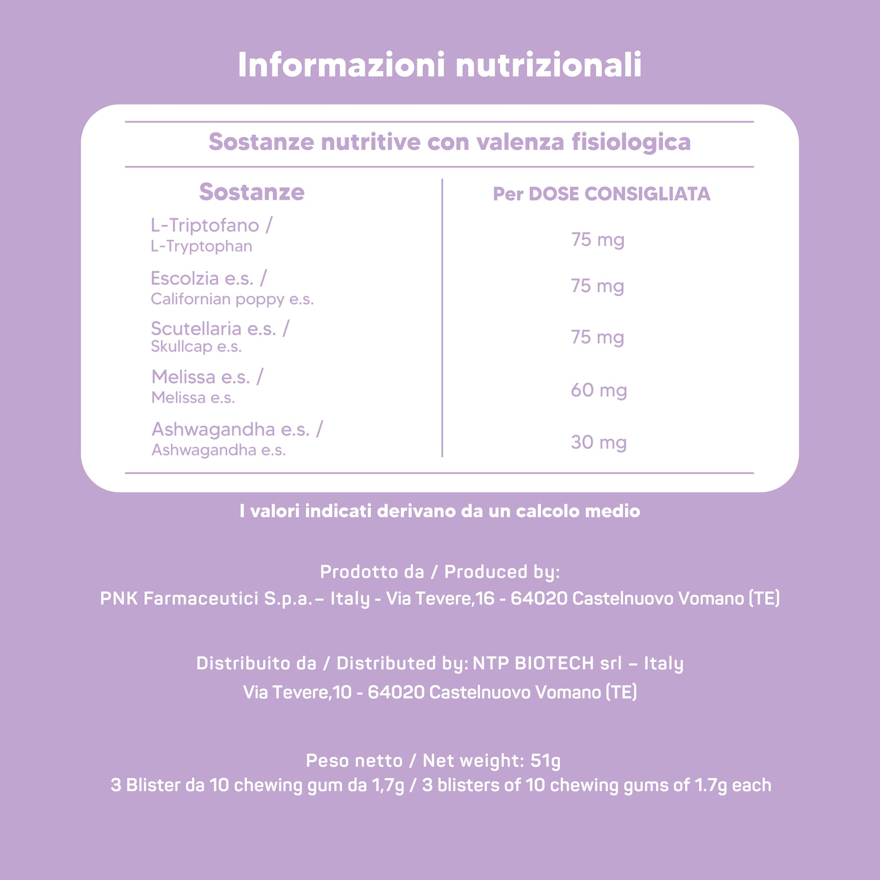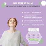No stress gum is a food supplement in chewing gum with plant extracts of Scutellaria and Melissa that promote relaxation and mental well-being and with Tryptophan. Indicated in situations of stress, anxiety, headache , and in case of reduced dietary intake or increased physiological need.