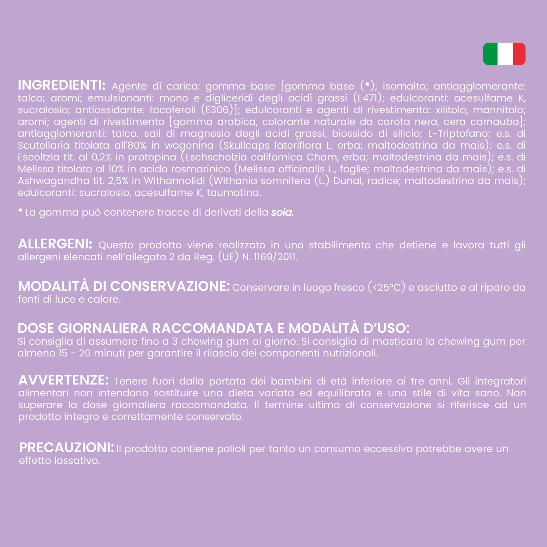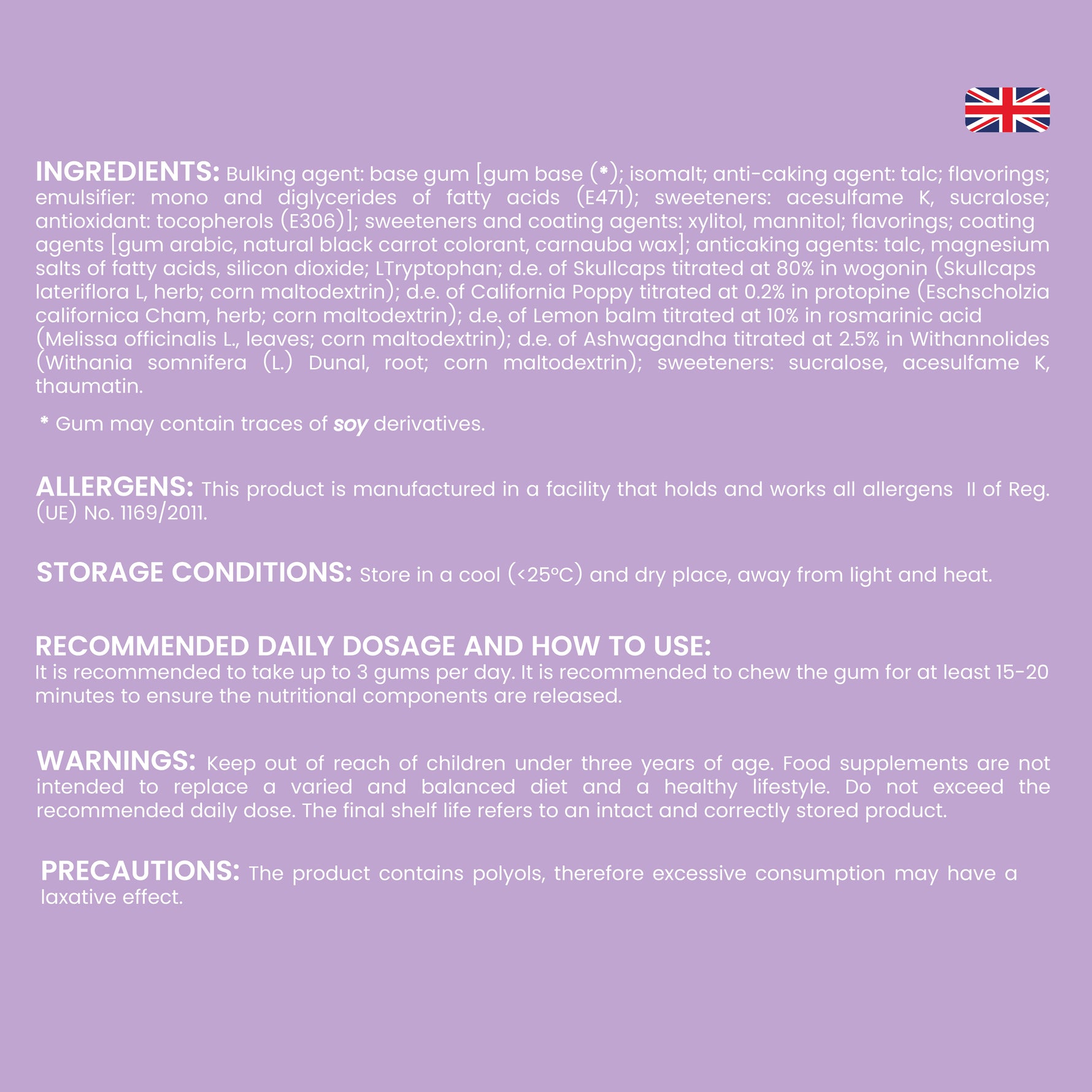 Generally, the effects of relaxation and well-being begin to be felt after about 10-15 minutes of chewing. It is recommended to chew the chewing gum for at least 15-20 minutes for an optimal release of the natural active ingredients.